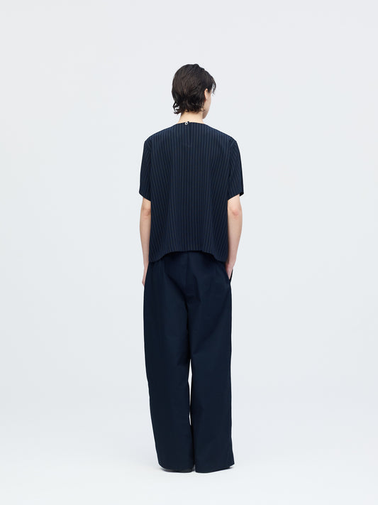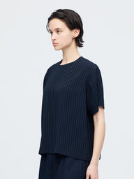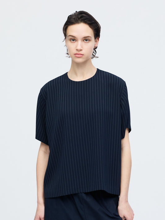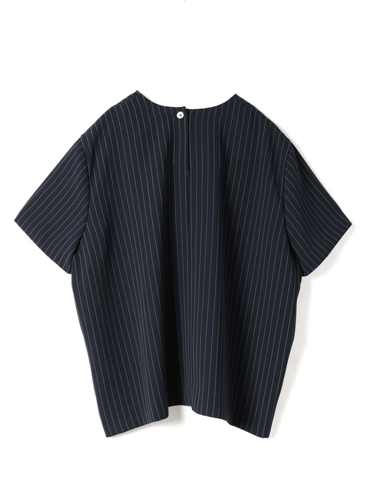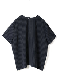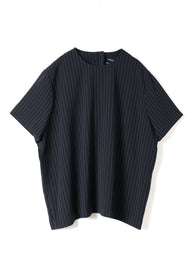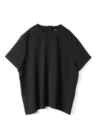 ストライプが目を引く、クルーネックのハーフスリーブシャツです。無駄を削ぎ落としたミニマルなデザインで、柄の表情を引き立てた一枚。シンプルながらも素材の存在感でスタイリングに奥行きをプラスします。