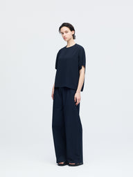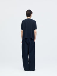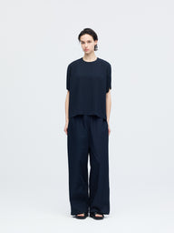 ほどよくゆとりを持たせたボックスシルエットに、やや短めの着丈がバランスの取りやすい設計。肘にかかる袖丈が落ち着いた印象を与え、ワイドパンツとも好相性です。