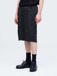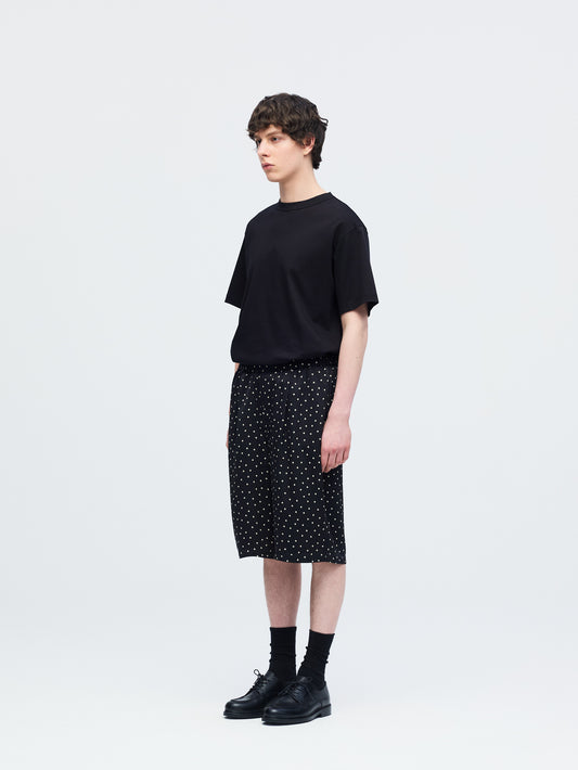 さりげないドットプリントが印象的な、ショートパンツです。細かなドット柄がスタイリングにアクセントを加えます。ウエストはゴム仕様で着脱しやすく快適な穿き心地。膝上丈の程よい着丈とゆとりのあるワイドシルエットで、軽やかな抜け感を演出します。しなやかなサテン素材が流れるように落ち、上品なドレープを描きながら快適な穿き心地を実現。落ち着いたトーンで合わせやすく、Tシャツと合わせてリラックスしたスタイルや、シャツと合わせて上品な着こなしも楽しめます。同素材のシャツ(1-530016)とセットアップもおすすめです。