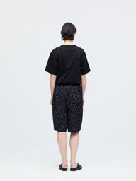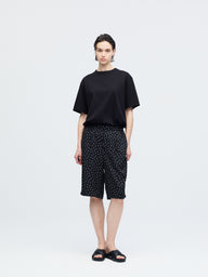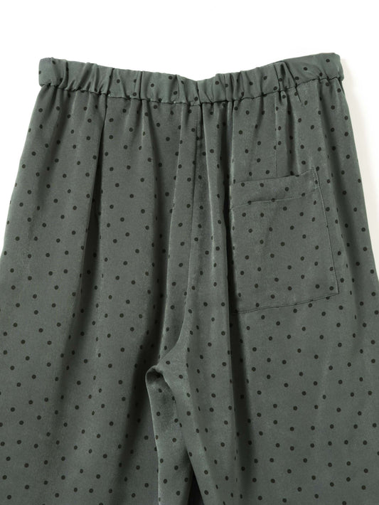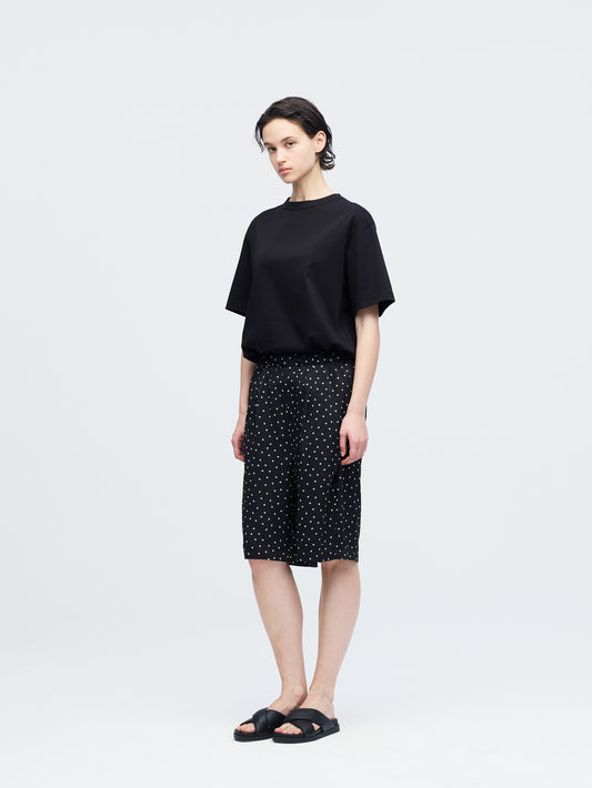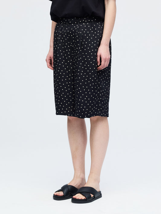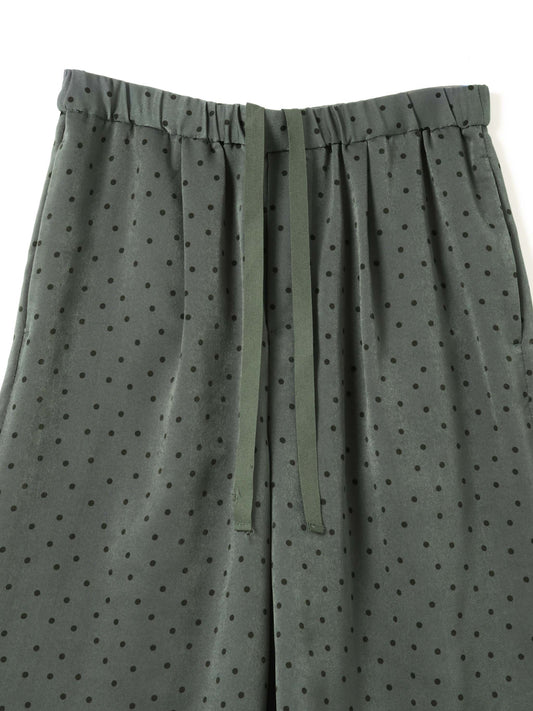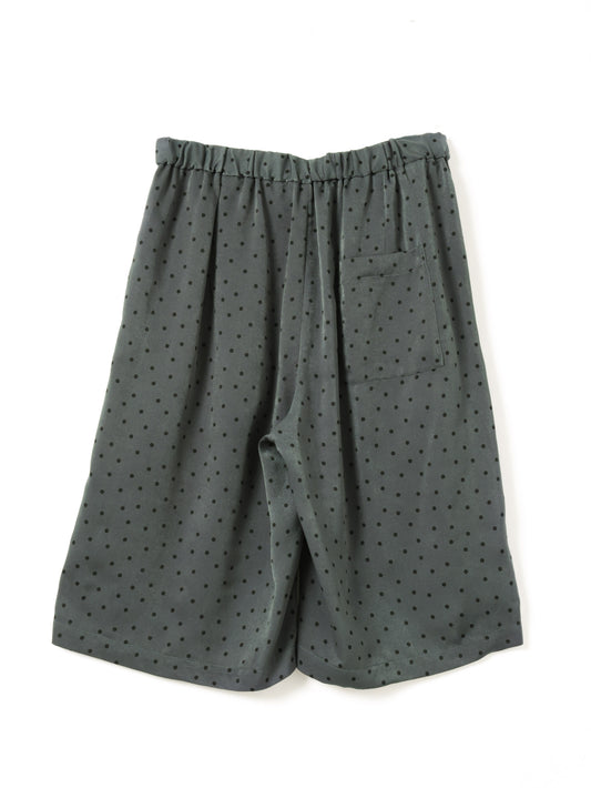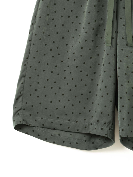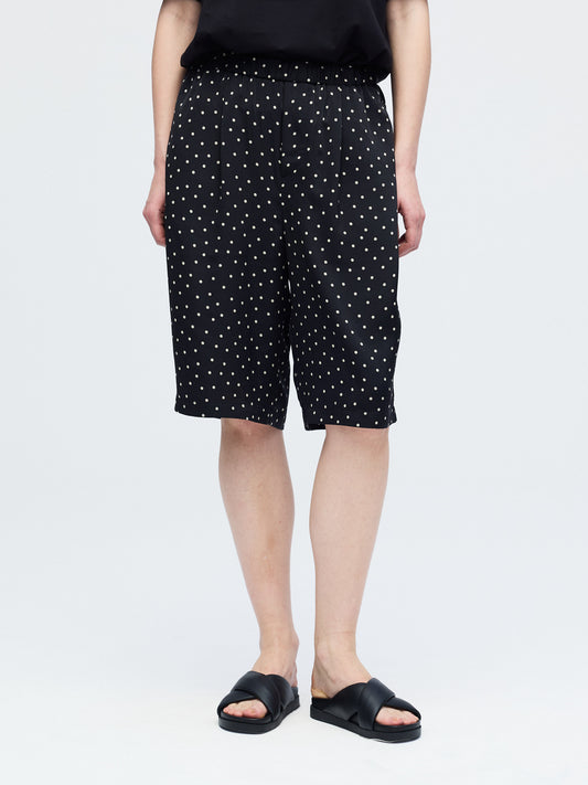 さりげないドットプリントが印象的な、ショートパンツです。細かなドット柄がスタイリングにアクセントを加えます。ウエストはゴム仕様で着脱しやすく快適な穿き心地。膝上丈の程よい着丈とゆとりのあるワイドシルエットで、軽やかな抜け感を演出します。しなやかなサテン素材が流れるように落ち、上品なドレープを描きながら快適な穿き心地を実現。落ち着いたトーンで合わせやすく、Tシャツと合わせてリラックスしたスタイルや、シャツと合わせて上品な着こなしも楽しめます。同素材のシャツ(1-530016)とセットアップもおすすめです。