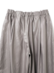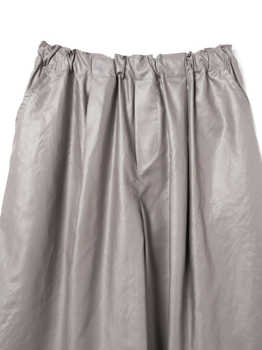 ほどよい光沢感が印象的な、ハーフワイドシルエットのイージーパンツです。ワイドすぎない程よいボリューム感で、軽やかなバランスのシルエットに仕上げています。動きに合わせて自然に揺れるラインが、シンプルなスタイリングにもさりげない存在感をプラスします。 ウエストはゴム仕様にドローストリング付きで、リラックス感のある快適な穿き心地。腰まわりにはゆとりを持たせながら、裾にかけてきれいに広がるシルエットがバランスよくまとまります。トップスをタックインしたスタイルもすっきりと決まります。 素材には、ワックスコットンのような光沢感を表現したポリエステル生地を使用。表面に熱処理を施すことで独特の艶と滑らかな質感を生み出しながら、ご家庭で洗える扱いやすさも兼ね備えています。きれい見えと快適さを両立した、デイリーに活躍する一着です。同素材でワイドカーゴパンツ( 1-560010/glossy wide cargo pants)も展開。