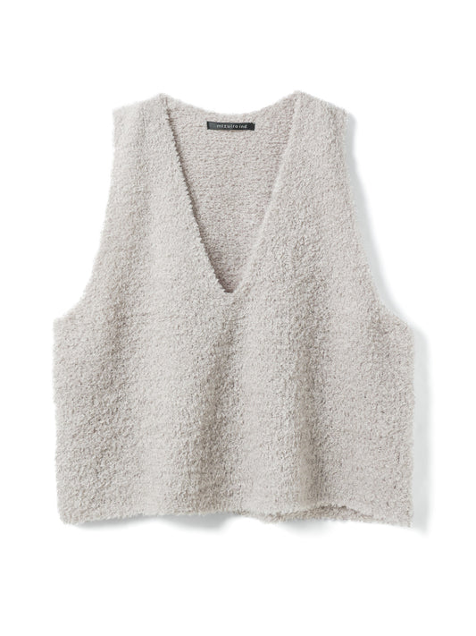 人気のへアリーVネックベストが今季も登場。昨年よりも少しコンパクトなシルエットに変更バランスよく着こなせるシルエットにアップデートしました。ループ編みのもこもことした素材感で寒い季節を温かく彩るへアリーヤーンのワイドベストです。丸みのある深Vネックがポイント。アームホールを広めに設計しアイテム問わず合わせやすくコーディネートで活躍します。リサイクルポリエステルのモール糸を使用したループヤーン。とても柔らかでふかふかの素材感。