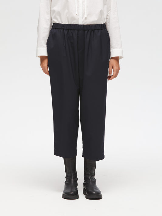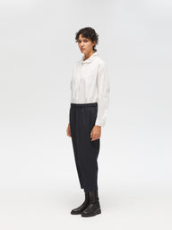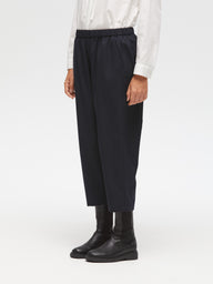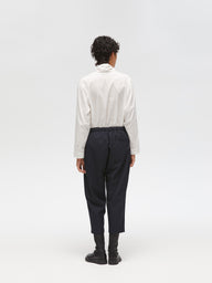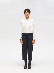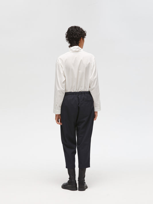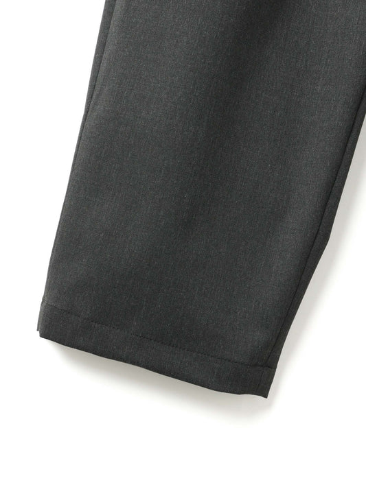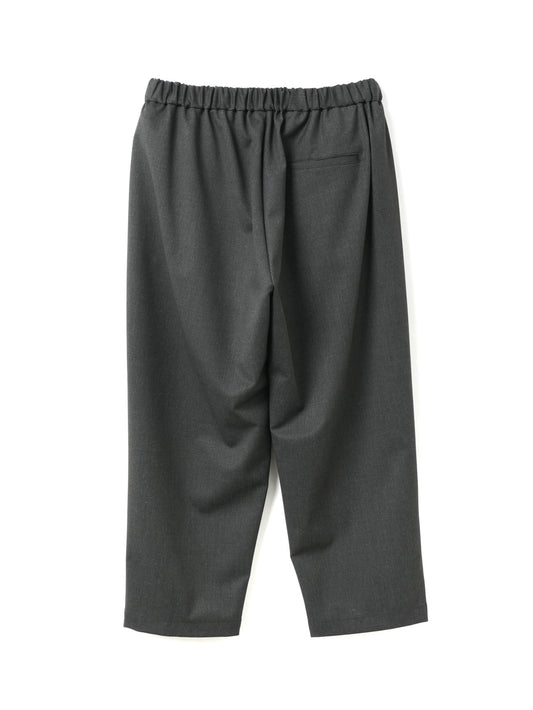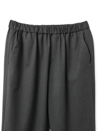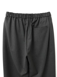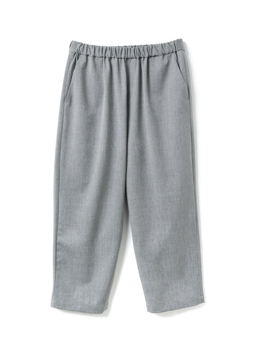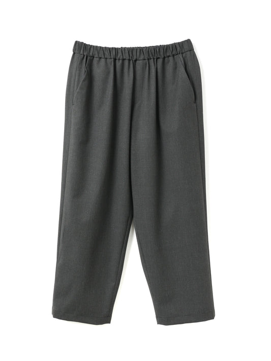 mizuiro indで人気の高い、長く愛されている定番シルエットのタックイージーパンツ。細すぎず太すぎない絶妙なサイズ感が特徴で、スタイリングの幅が広がります。9分丈のやや短めの設計で、ブーツとのコーディネートも楽しめる一枚。柔らかく落ち感のあるポリエステル×ウール素材を使用し、上品なトラッド感を演出します。ウエストはゴム仕様でリラックスした穿き心地ながら、フロントフェイクデザインによりトップスインのスタイルにも対応。サイド・バックポケット付き。