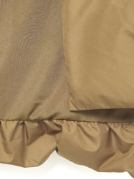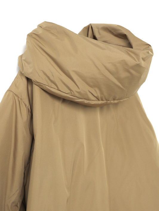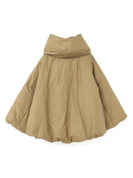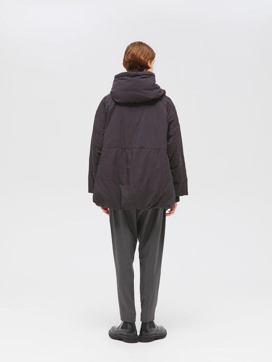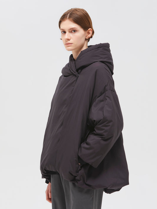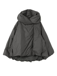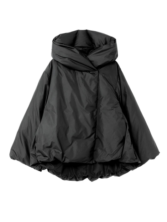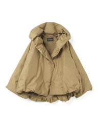 mizuiro ind 人気のフード付きショートダウン。後ろ下がりのフレアなシルエットで袖口と裾は内側に向けて丸みが出るように設計。ぷっくりとボリューム感のあるシルエットが印象的。フード部分にもボリュームを持たせています。ダブルボタンで前を合わせて着用するスタイル。前を開けたときにも目立たないよう同系色のスナップボタンを使用しています。ショート丈でボリュームのあるボトムスと好相性。ダウンとフェザーで温かさは抜群。スムースでほどよく光沢のある素材感。軽量で重くなりがちな冬のスタイルを軽やかにスタイリングできます。