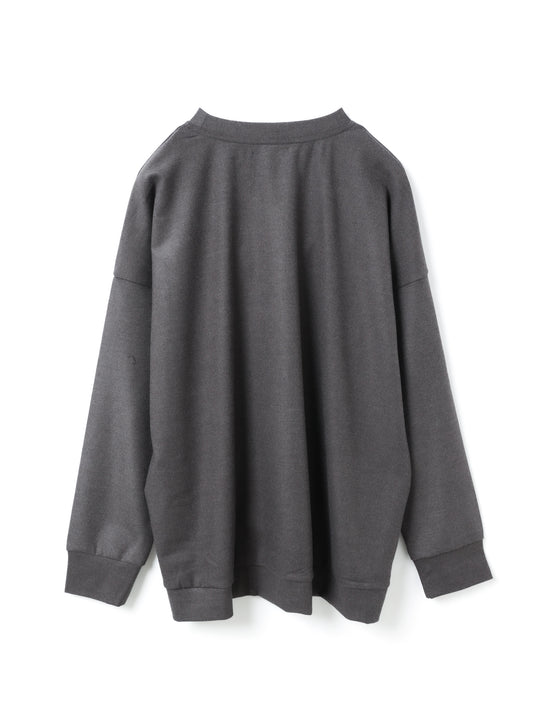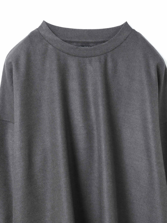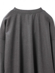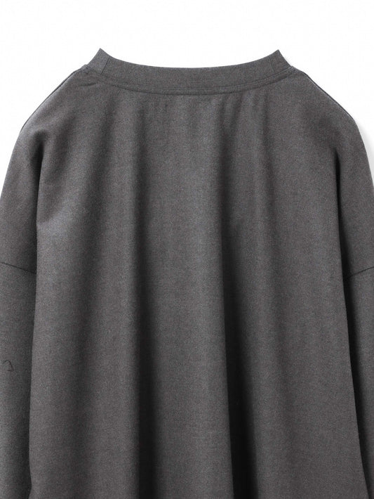 浅めのクルーネックと落ち感のあるワイドシルエットが、抜け感と上品さを兼ね備えたクルーネックワイドトップス。前後差のあるラウンドヘムがレイヤードスタイルを引き立て、さりげない立体感を演出します。スーツライクな微起毛素材を使用しており、温かみときれいめな印象を両立した一枚です。同素材のイージーパンツ(3-560002/center press easy slacks)とセットアップもおすすめ。