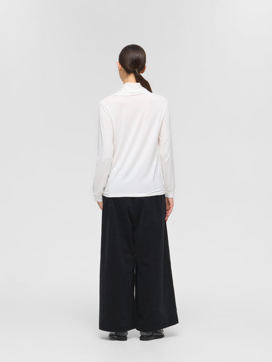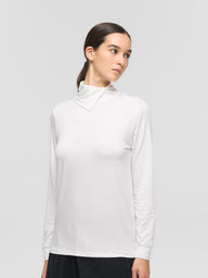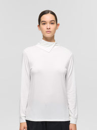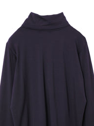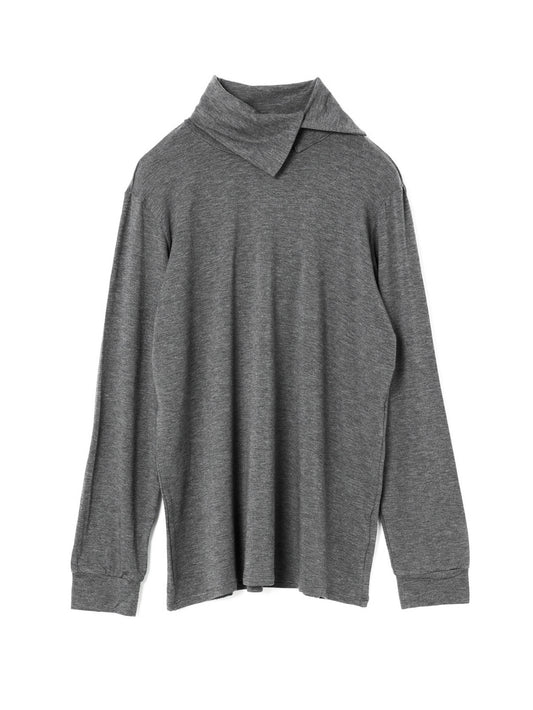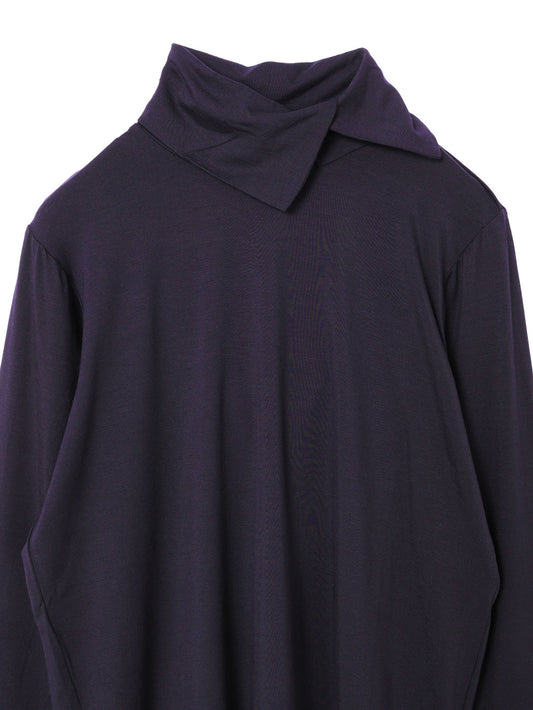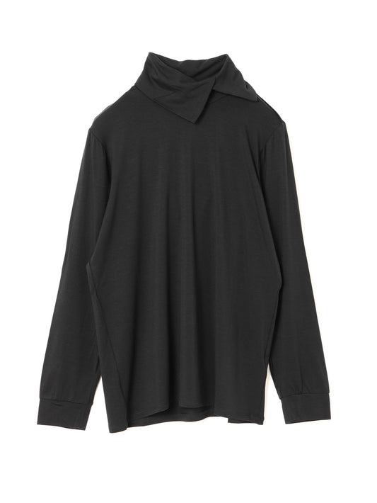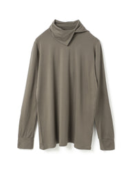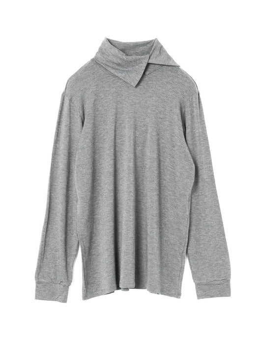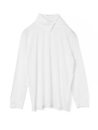 アシンメトリーな襟デザインが目を引く、新鮮な印象のカットソーです。カラー部分はハイネック仕様で首元まで暖かく、重ね着した際のアクセントにもぴったり。ジャストなサイジングで、インナーとしても一枚でも着やすく、コーディネートの幅を広げます。とても伸びの良いベア天竺素材を使用し、もちもちとした柔らかい肌触りが心地のよさを体感いただけえます。淡いカラーはやや透け感があるため、インナーとのレイヤードスタイルも楽しめます。シンプルながらディテールにこだわった、デイリースタイルに活躍する一枚です。