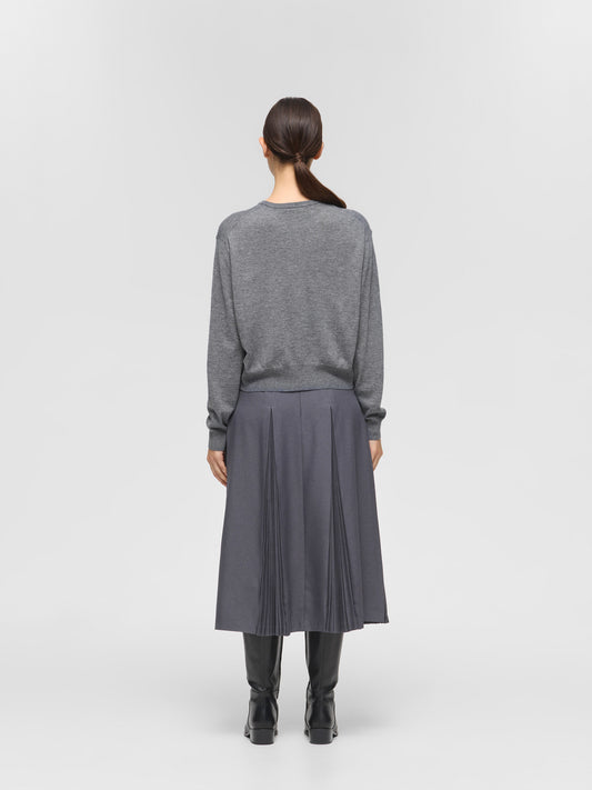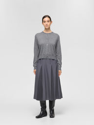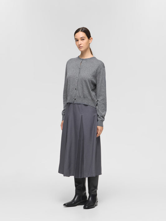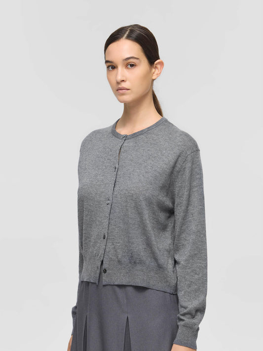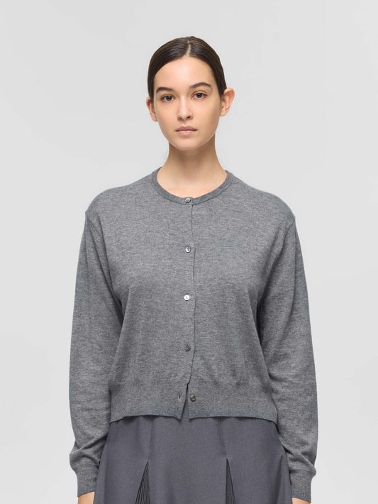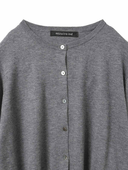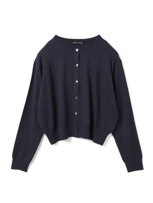 ハイゲージニットシリーズのクルーネックカーディガンです。ショート丈でミニマルなデザインが特徴。ほどよくワイドな身幅と落ち感のあるシルエットが、雰囲気のある着こなしを演出します。裾の太めのリブがデザインのアクセントに。ウール100%の16ゲージニットを使用し、なめらかで肌触りが良く、あたたかな着心地です。ほどよく薄手で重ね着しやすく、ロングシーズン活躍します。手洗い可能。同素材でプルオーバー(4-220101 / poncho like P/O)、ワンピース(4-220102 / HG stand collar OP)も展開。