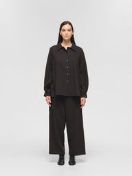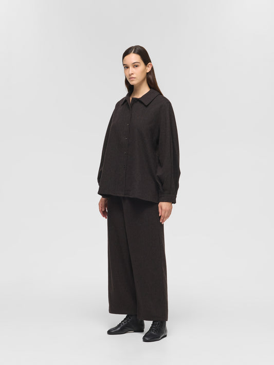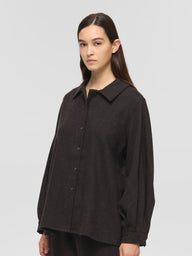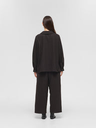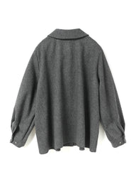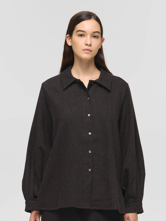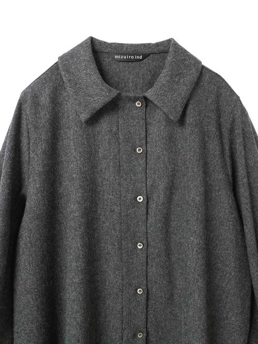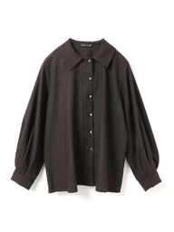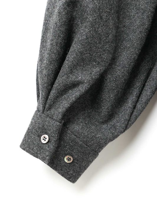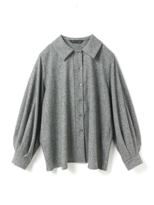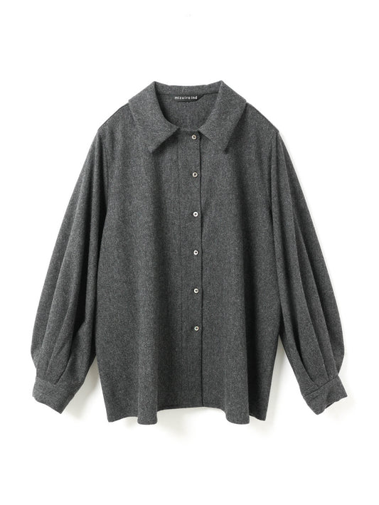 袖にタックを入れたボリュームのあるバルーンスリーブが印象的なチュニックシャツブラウス。フロントボタンは小さく上品に仕上げ、首元はクルーネックに幅広の襟を付けたようなデザインで女性らしい表情を演出します。ゆったりとしたビッグシルエットでも落ち感のあるフレアなシルエット&チュニック丈で体のラインをさりげなくカバーしすっきりと着こなしていただけます。袖口はカフスにボタンを2つ配し、着こなしに合わせて調整可能です。軽くて温かなウール混素材で、寒い季節も温かく着用いただけます。感のあるニュアンス豊かな生地が、上品でやわらかな表情を引き立てます。同素材でパンツ(4-260059/wool blend easy PT)も展開しており、セットアップでのスタイリングもおすすめです。