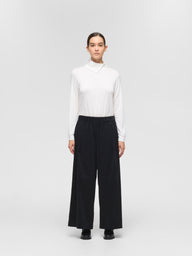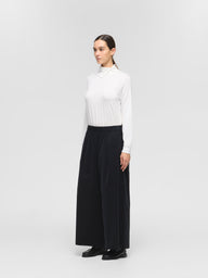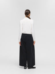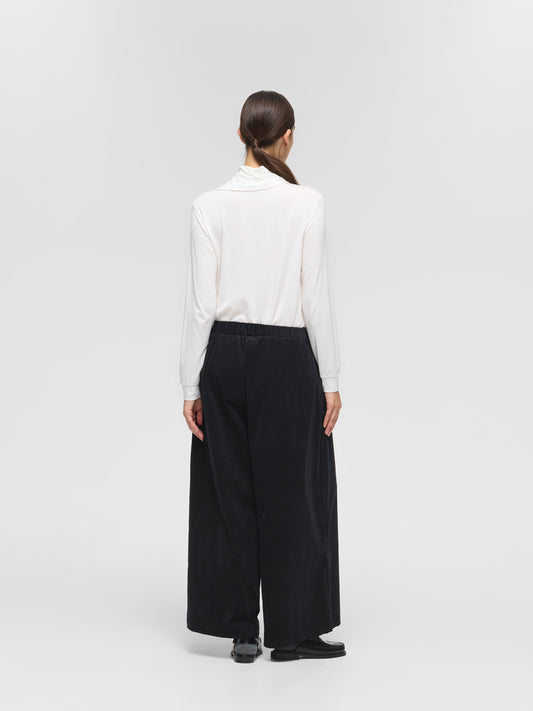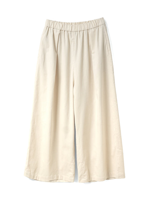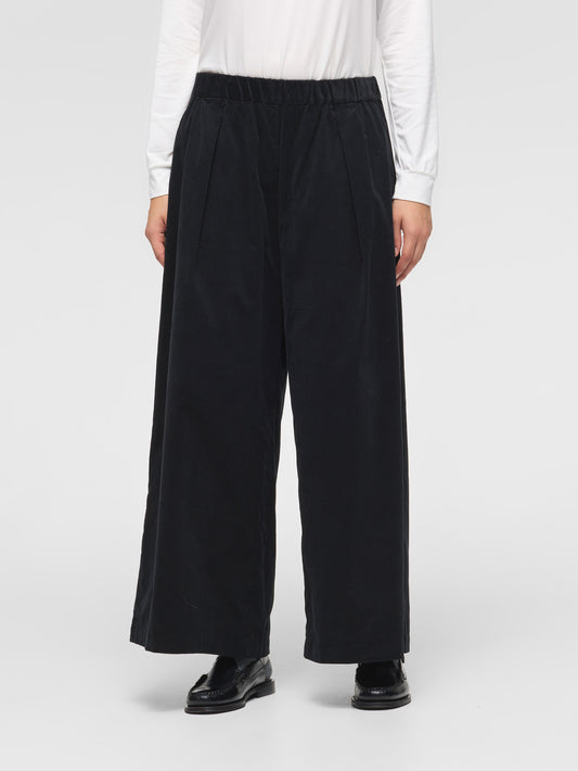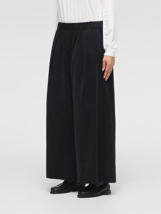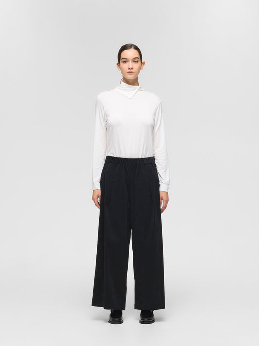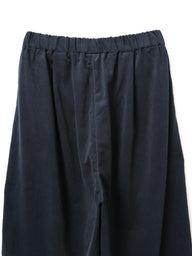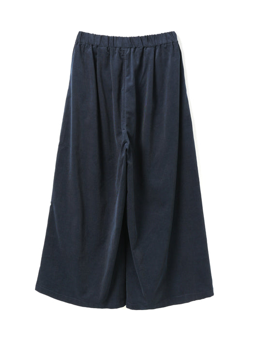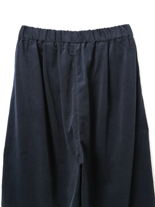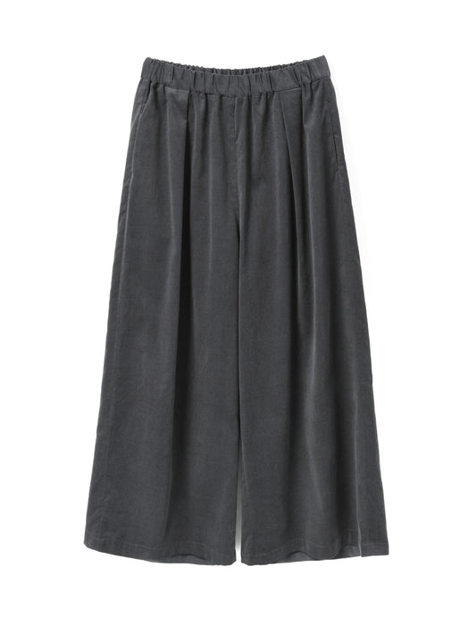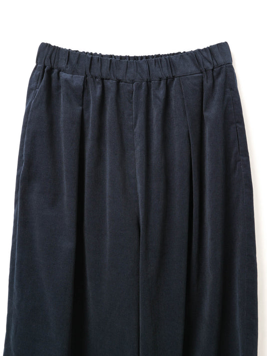 ややハリのある細コーデュロイを使用した、タックワイドパンツ。ワイドに広がるシルエットが魅力で、ほどよいボリューム感がありながらも落ち感のある仕上がりです。ウエストはリラックス感のあるゴム仕様で、快適な穿き心地に。フルレングスのベーシックなデザインは、さまざまなトップスと相性がよく、幅広いコーディネートを楽しめる1本です。同シリーズのプルオーバー(4-230061/corduroy cocoon P/O)とセットアップもおすすめです。
