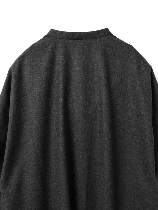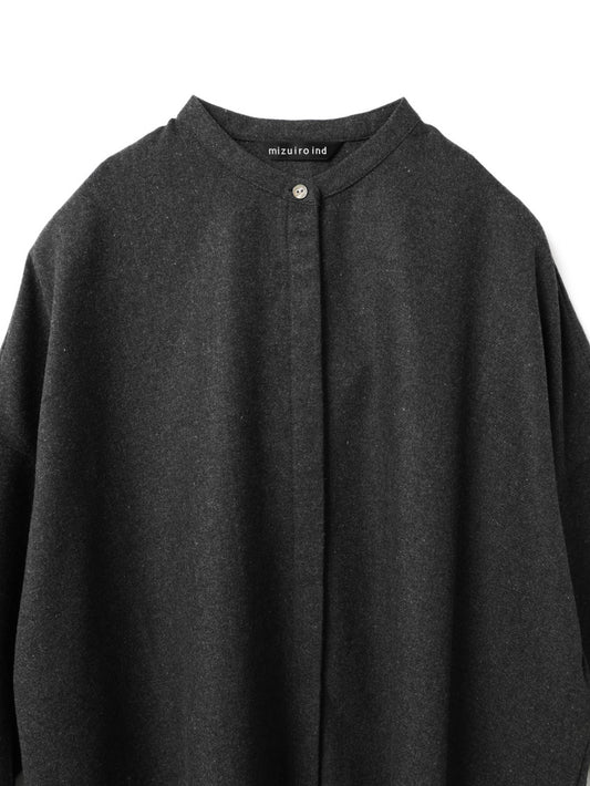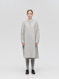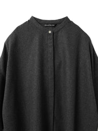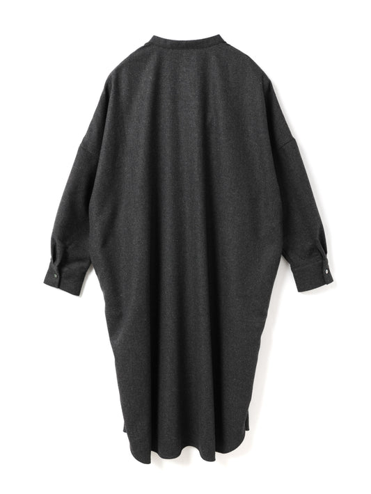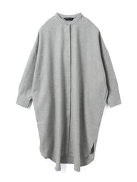 スタンドカラーのすっきりとしたスタイルが印象的なシャツワンピース。フロントは比翼仕立てで、ミニマルなデザインに仕上げました。ワイドなシルエットにドロップショルダーの落ち感の出るシルエットで動きのあるスタイルを演出。裾のラウンドシルエットとサイドスリットが軽やかなアクセントでパンツとのスタイリングもおすすめです。ウール混のあたたかな素材感。季節の変わり目にはライトアウターとしても活躍します。サイドポケット付き、裏地なし。同素材でシャツ(4-230067 / wool blend basic shirt)、パンツ(4-260076 / wool blend wide easy PT)も展開。