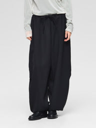 這款褲子以褲腳鬆緊設計為特色。膝部加入小摺設計,打造立體圓潤感,使動態效果更顯活潑。腰部採用鬆緊帶與抽繩,可自由調整尺寸。輕薄且具垂墜感的材質呈現時尚剪裁,同時混羊毛材質在寒冷季節保持溫暖。採用不易皺折的功能性面料,可在家清洗。無內裡,設有側口袋。